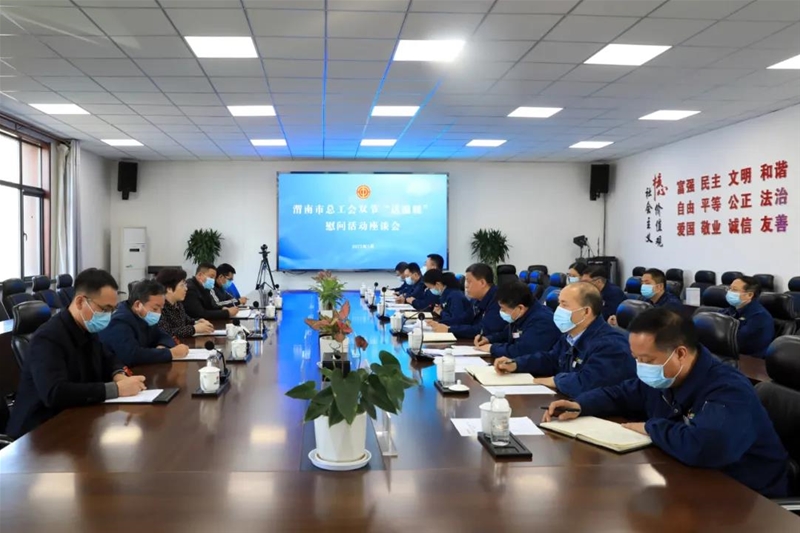 1月18日,渭南市總工會黨組書記、常務(wù)副主席侯雪靜,韓城市總工會常務(wù)副主席李養(yǎng)義一行來公司“送溫暖”,并召開座談會。公司黨委副書記、總經(jīng)理李都宏,黨委委員、工會主席趙春棠,各基層工會主席、相關(guān)部門負(fù)責(zé)同志參會。