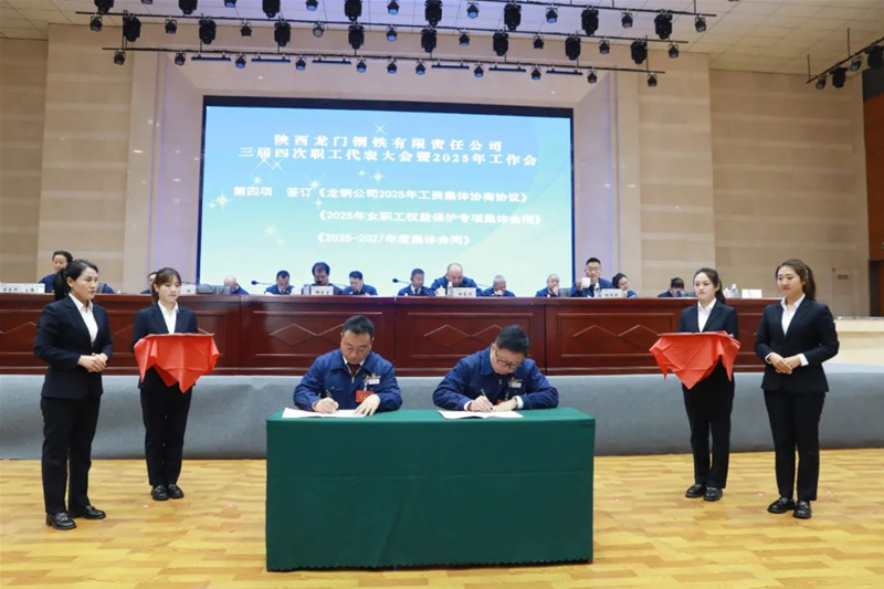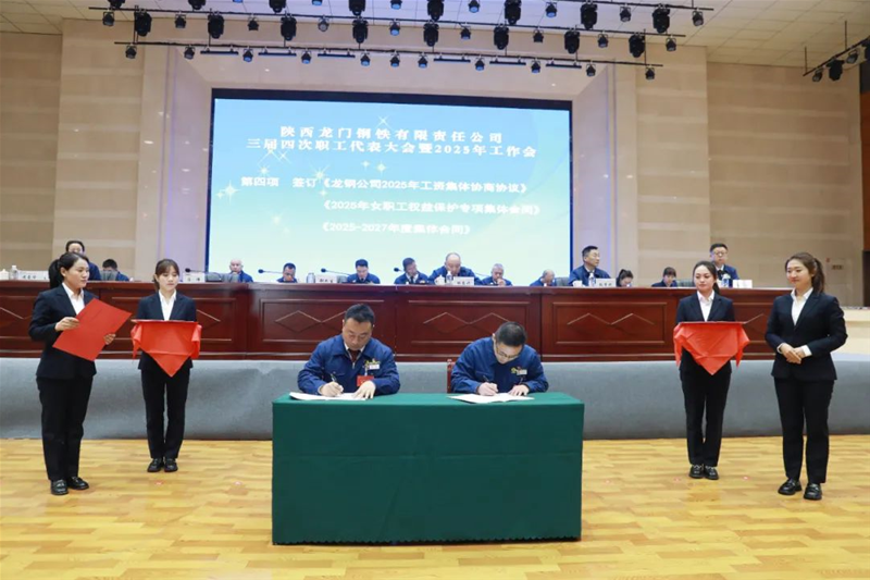 會上簽訂了《龍鋼公司2025年工資集體協(xié)商協(xié)議》《2025年女職工權(quán)益保護專項集體合同》《2025—2027年度集體合同》《2025年經(jīng)營目標責(zé)任書》《2025年安全環(huán)保目標責(zé)任書》。