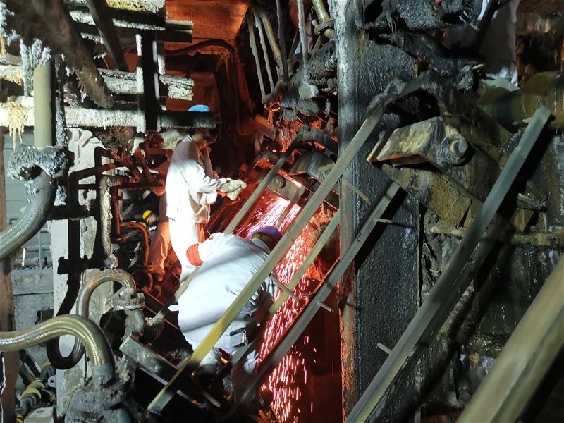 剛剛停機(jī)的現(xiàn)場,被熱浪團(tuán)團(tuán)包裹,像極了一個(gè)巨型蒸籠。檢修時(shí)間只有兩小時(shí),這對(duì)他們來說,無疑是一個(gè)挑戰(zhàn),大家等不及設(shè)備溫度降下來,就迫不及待地來到各自負(fù)責(zé)區(qū)域,一瞬間,澆鋼區(qū)、二冷室、拉矯機(jī)、輥道旁……人頭攢動(dòng)、熱鬧非凡。二冷室內(nèi)潮濕悶熱,作業(yè)環(huán)境復(fù)雜,讓人呼吸都變得困難,幾名身穿白色阻燃服的中包工,順著噴淋管爬上爬下,他們腳踩在細(xì)細(xì)的支架上。這群“蜘蛛俠”在縱橫交錯(cuò)的管道間,隨意調(diào)整著身體,有的仔細(xì)清理噴咀,有的認(rèn)真切割冷鋼,這看起來困難重重的工作,他們卻游刃有余。不一會(huì),他們厚厚的工作服被汗水浸濕,臉上的汗水也在大負(fù)荷照明燈下泛著亮光??杀M管如此,他們的目光始終盯在設(shè)備上,沒有半分懈怠。