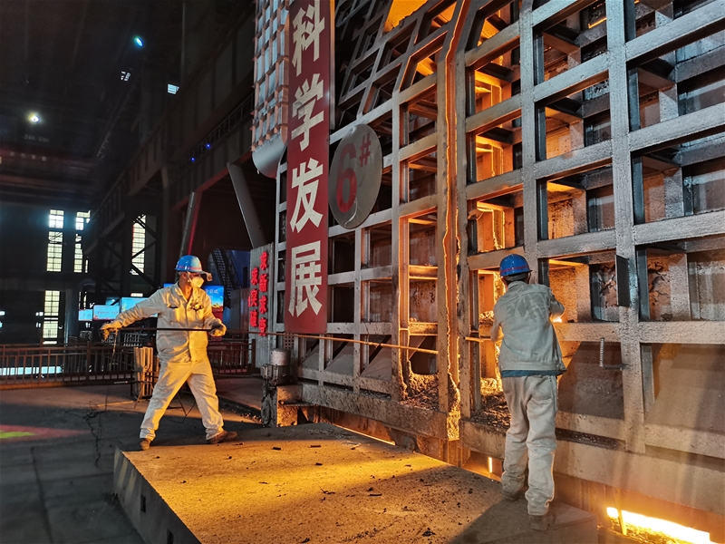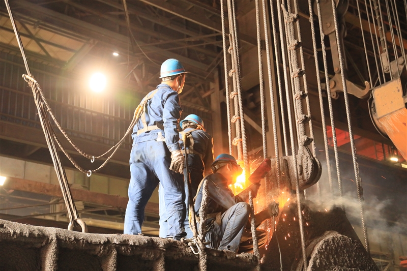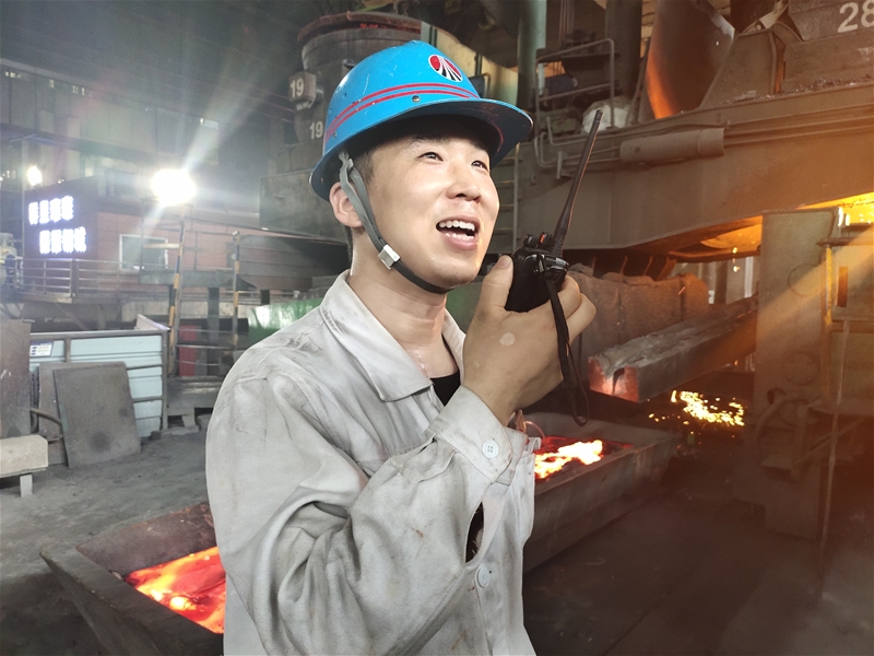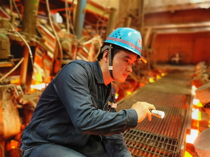 圖八:煉鋼廠連二作業(yè)區(qū)6#連鑄機中包工何武濤正在對在線水口、機件進行檢查。面對眼前1500℃的鋼水,他眼戴護目鏡,身穿阻燃服,在汗流浹背中守護著安全生產(chǎn)。