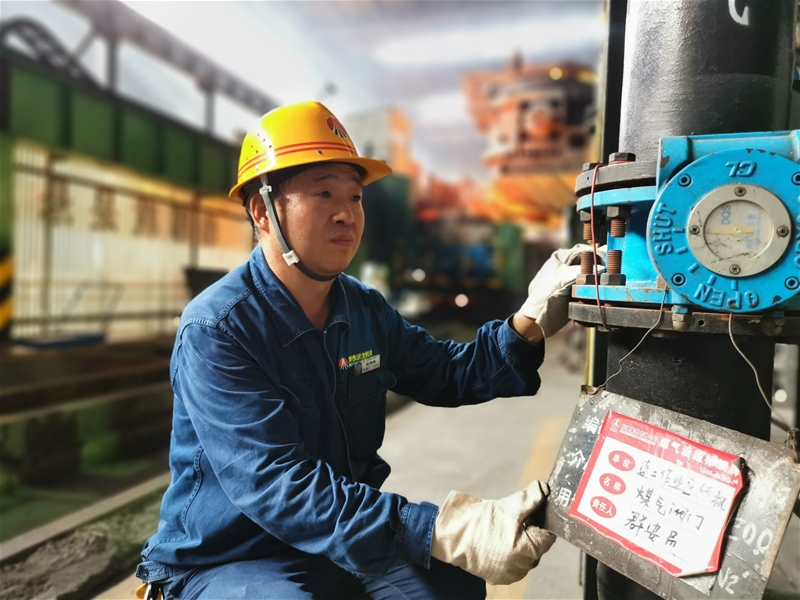 圖三:煉鋼廠連二作業(yè)區(qū)安全員張保銀正在檢查煤氣設(shè)備,現(xiàn)場的溫度持續(xù)攀升,汗珠順著他的臉頰滾落,但是他始終牢記自己的職責與使命,不放過任何一個細節(jié),用實 際行動踐行著自己的安全誓言。