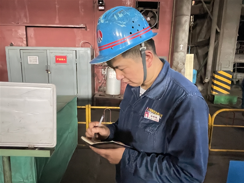 圖九:煉鋼廠天車作業(yè)區(qū)天車工李鋒博在記錄設(shè)備運行情況,他所在的出坯垮地面全是1000℃的紅坯,熱量持續(xù)往上方擴散,臉上的汗珠往下滑落,不變的是他對設(shè)備的認真負責。