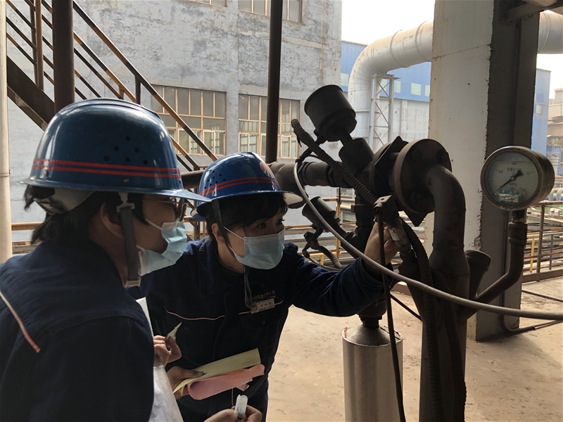 為確保生產(chǎn)正常運(yùn)行,她們置身生產(chǎn)一線,利用便攜式檢測(cè)設(shè)備,對(duì)壓力、溫度、流量、電磁等測(cè)量?jī)x器進(jìn)行在線檢測(cè)。壓力設(shè)備采取相同壓力源多點(diǎn)位進(jìn)行比對(duì),計(jì)算誤差值是否在允許范圍內(nèi);溫度類設(shè)備先使用紅外測(cè)溫儀進(jìn)行測(cè)試,再根據(jù)主控室顯示的數(shù)據(jù)進(jìn)行比對(duì),判定其是否合格;電能表則通過(guò)標(biāo)準(zhǔn)表與被檢表相連接,通過(guò)變比值計(jì)算出電流值,根據(jù)現(xiàn)場(chǎng)電壓值與標(biāo)準(zhǔn)器示值進(jìn)行比對(duì);在線流量積算儀通過(guò)與多功能信號(hào)儀連接,在線檢測(cè)輸出信號(hào)值是否在允許范圍內(nèi)……她們瘦小的身影穿梭在縱橫交錯(cuò)的設(shè)備與管道間,為一臺(tái)臺(tái)測(cè)量設(shè)備檢測(cè)、分析,與現(xiàn)場(chǎng)工作人員進(jìn)行溝通,確認(rèn)每一臺(tái)設(shè)備性能正常。