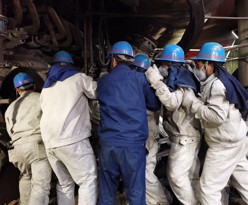 12日早晨9點鐘,高爐風口平臺上,溫度滾燙,但這絲毫不能阻擋參檢爐前工們奮進的步伐。他們身著白色阻燃服,在熱浪拂面的14#風口旁兩兩一組,精誠團結(jié)、合力攻堅,一人雙手緊握鋼釬,一人使出全身力氣揮舞鐵錘,正全神貫注清理風口套里面的殘渣……