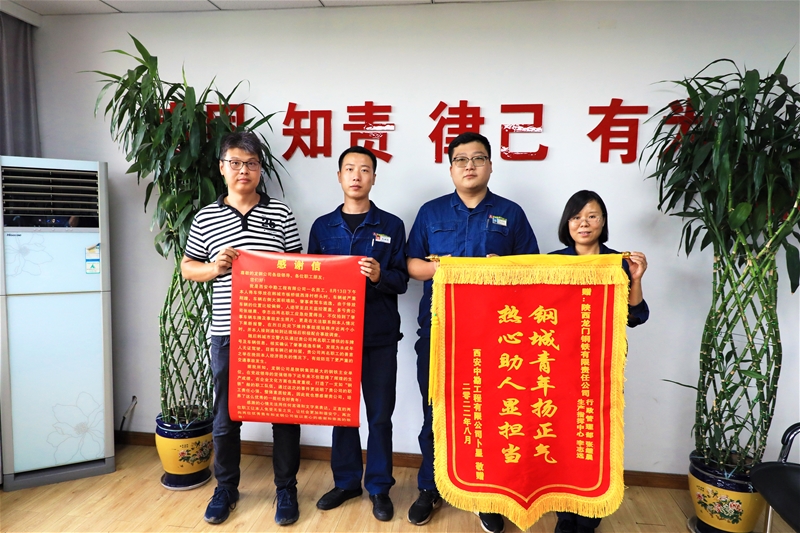 8月15日,西安中勘工程有限公司卜師傅專程趕到龍鋼公司,送來一面寫有“鋼城青年揚正氣 熱心助人顯擔當”的錦旗和一封感謝信,表達對公司兩名員工張繼晨、李志遠幫助自己挽回經(jīng)濟損失的感激之情。