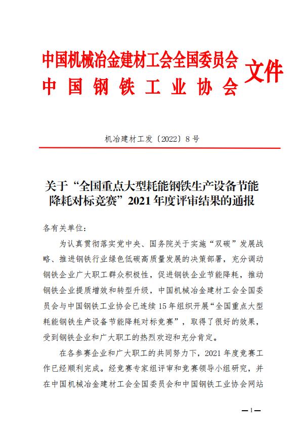 近日,從中國鋼鐵工業(yè)協(xié)會獲悉,由中國機(jī)械冶金建材工會全國委員會與中國鋼鐵工業(yè)協(xié)會聯(lián)合開展的“2021年度全國重點(diǎn)大型耗能鋼鐵生產(chǎn)設(shè)備節(jié)能降耗對標(biāo)競賽”結(jié)果揭曉,龍鋼公司5#轉(zhuǎn)爐榮獲節(jié)能降耗“優(yōu)勝爐”、450m2燒結(jié)機(jī)榮獲節(jié)能降耗“創(chuàng)先爐”。尤其5#轉(zhuǎn)爐是陜鋼集團(tuán)單座爐機(jī)線首次獲得優(yōu)勝爐,標(biāo)志著陜鋼集團(tuán)設(shè)備能耗水平逐步邁入行業(yè)先進(jìn)序列。