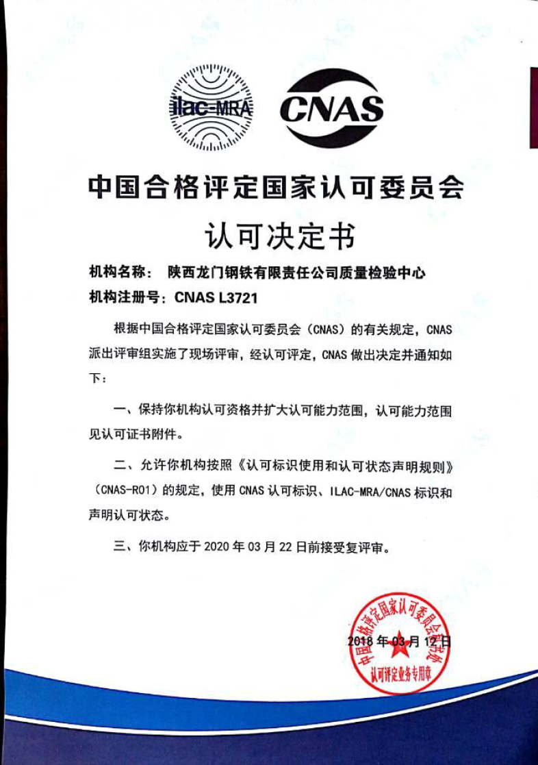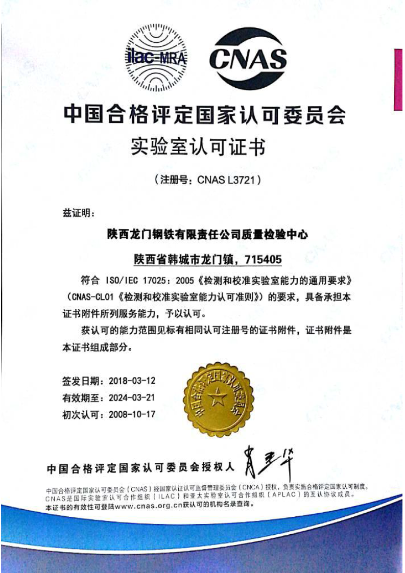 龍鋼公司能源檢計(jì)量中心質(zhì)量檢驗(yàn)中心擁有進(jìn)口X-熒光儀、真空直讀光譜儀、紅外碳硫儀、全自動(dòng)工業(yè)分析儀、熱反應(yīng)測定儀、煤質(zhì)巖相儀、電液伺服萬能試驗(yàn)機(jī)、鋼筋彎曲和反彎試驗(yàn)機(jī)、維氏硬度計(jì)、金相顯微鏡、掃描電鏡、氧氮?dú)鋬x等質(zhì)量控制檢驗(yàn)檢測設(shè)備,整體裝備水平處于國內(nèi)領(lǐng)先地位。2008年,公司質(zhì)量檢驗(yàn)中心獲得國家實(shí)驗(yàn)室認(rèn)可證書,并連年通過國家認(rèn)可審核及標(biāo)準(zhǔn)能力檢測驗(yàn)證。