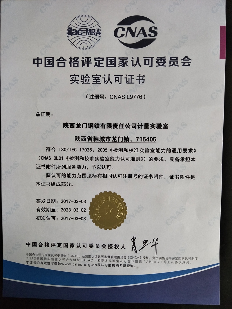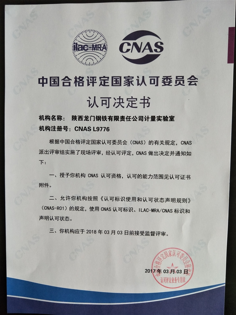 陜西龍門(mén)鋼鐵有限責(zé)任公司計(jì)量實(shí)驗(yàn)室具有25年測(cè)量設(shè)備校檢歷史,具有公司力學(xué)、熱工、長(zhǎng)度、電磁、理化五大類(lèi)18項(xiàng)最高計(jì)量標(biāo)準(zhǔn), 208臺(tái)(套)計(jì)量標(biāo)準(zhǔn)器具,實(shí)驗(yàn)室具有獨(dú)立校檢面積360平方米,下設(shè)熱工檢定室、壓力檢定室、高溫檢定室、長(zhǎng)度檢定室、容器檢定室、電磁檢定室、氣體檢定室、質(zhì)量檢定室等多個(gè)專(zhuān)業(yè)檢定室,具有年校檢測(cè)量?jī)x器設(shè)備2萬(wàn)臺(tái)的能力.