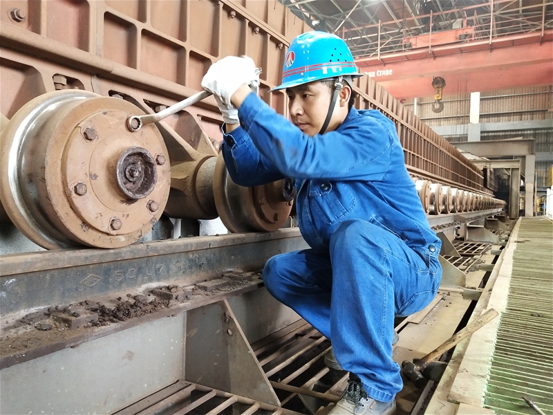 圖9:安全是精心點(diǎn)檢維護(hù),時(shí)刻讓設(shè)備保持最佳工況!點(diǎn)檢員郭永樂利用停機(jī)間隙對(duì)臺(tái)車滾輪進(jìn)行抽檢。