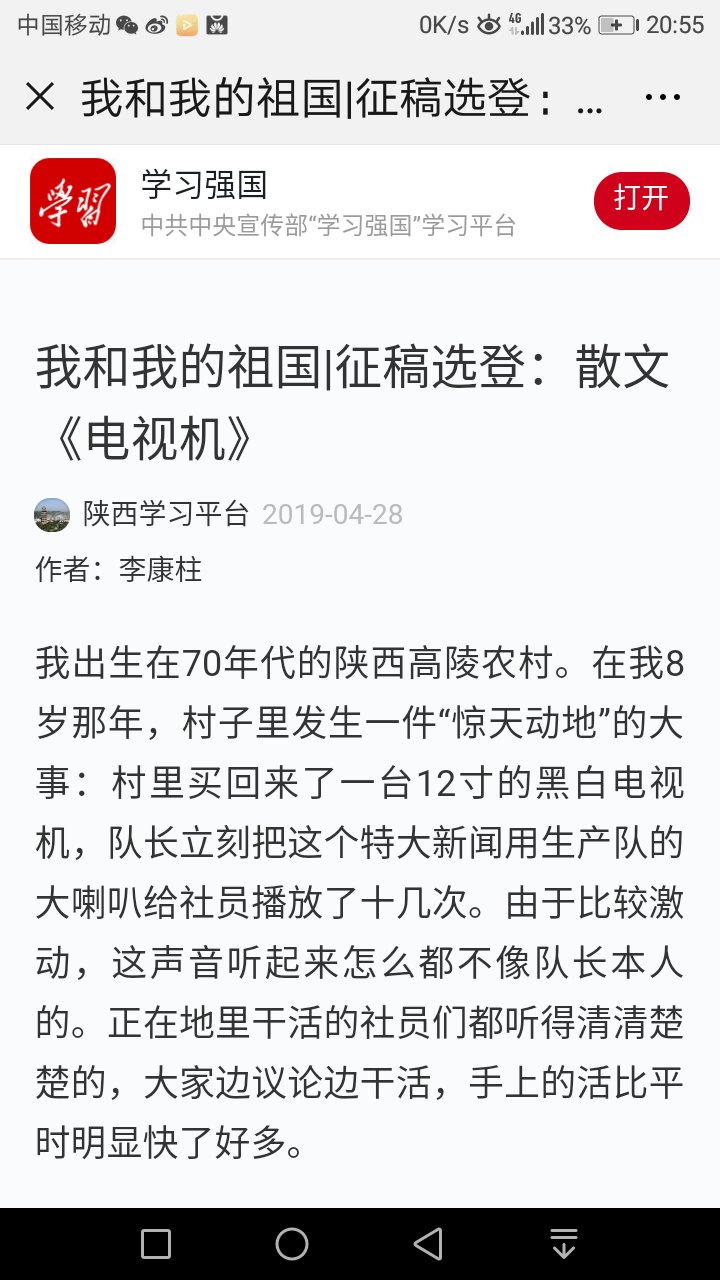 4月28日,當大家正在瀏覽學習強國中,突然發(fā)現(xiàn)一篇我和我的祖國征文---《電視機》被刊載,作者的是陜鋼龍鋼公司規(guī)劃發(fā)展部職工李康柱。李康柱的文章被學習強國刊載在龍鋼公司黨員職工中引起熱議。大家紛紛向李康柱打來電話表示祝賀,你的文章學習強國刊載了!