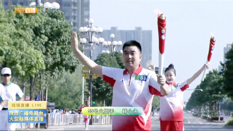 陜鋼集團形象代言人、陜鋼集團工會副主席、龍鋼公司煉鋼廠主任技師薛小永作為韓城站第55號火炬手,在韓城市礦馨園小區(qū)東南側與復興路十字北路段進行了火炬?zhèn)鬟f。