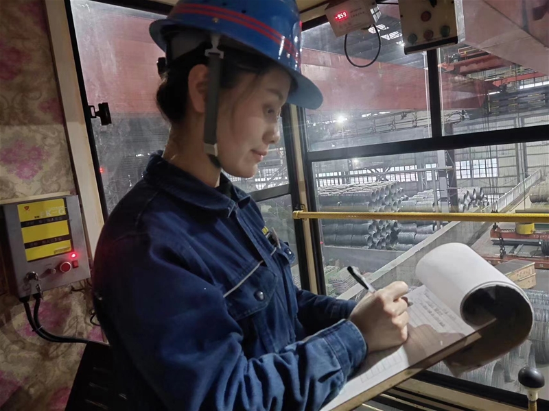 2019年9月,作為新入職大學(xué)生的她加入軋鋼廠天車工這個(gè)大家庭。身為學(xué)徒,在看到師傅第一時(shí)間處理軋線飛鋼的從容時(shí),她便在心里默默立下目標(biāo):“我要抓緊時(shí)間努力練習(xí),爭(zhēng)取早日出師,做獨(dú)當(dāng)一面的員工。”于是,在后來(lái)的學(xué)習(xí)中,她盡可能地抓住每一次可以練習(xí)穩(wěn)鉤、開車的機(jī)會(huì),買飯的路上風(fēng)馳電掣,打掃衛(wèi)生馬不解鞍。為減少如廁次數(shù),她盡量少喝水,有時(shí)甚至幾個(gè)小時(shí)都不喝水。在崗的時(shí)間被她合理安排,下班之后她仍然堅(jiān)持學(xué)習(xí),穩(wěn)扎穩(wěn)打的基本功在她的爭(zhēng)分奪秒中迅速得到提升。帶著進(jìn)廠時(shí)的初心,她成為同一批學(xué)徒中最早出師的女天車工。