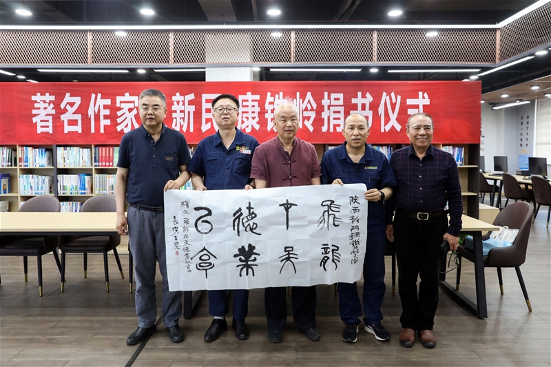儀式上,王新民為公司捐贈(zèng)了散文集《行余集》《賈平凹紀(jì)事》《春華秋實(shí)》等文學(xué)作品10冊(cè),康鐵嶺捐贈(zèng)了長(zhǎng)篇小說(shuō)《書院門1991》4套。同時(shí),王慶捐贈(zèng)了《飛龍?jiān)谔?德業(yè)以享》書法作品。