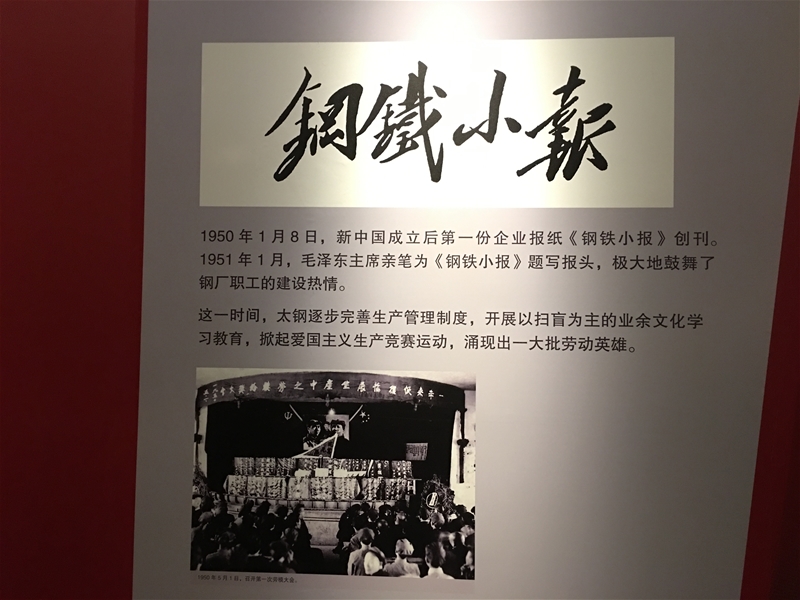 在“太鋼杯”全國冶金美術(shù)書法展覽上,得以觀賞來自四十余家冶金單位職工創(chuàng)作的油畫、國畫、版畫、真草行篆各類作品,讓人真切享受到一道文藝精神大餐。在太鋼廠史展覽館,代表們進入了一場八十四年的時光之旅。仿制的青磚灰瓦的西北鋼鐵廠大門,孫中山、閻錫山先生的黑白影像,瞬間將人拉回到實業(yè)興華、產(chǎn)業(yè)報國的上世紀(jì)初。毛澤東曾為全國第一份企業(yè)報紙,即太鋼《鋼鐵小報》題寫報名,令人對太鋼新聞事業(yè)的歷史心生幾分羨慕。館內(nèi)的珠港澳大橋、軍艦、坦克、神舟三號、圓珠筆芯頭、手撕鋼等等元素,讓人更加驚嘆于太鋼產(chǎn)品在科技上的先進實力。