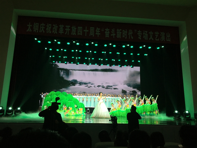 如果說參觀活動是開胃菜,其后的太鋼慶祝改革開放四十周年奮斗新時代專場文藝演出,則更讓代表們感受到太鋼職工深厚壯美的精神底蘊。開場節(jié)目《黃河鼓韻》把觀眾帶入到大浪滔滔、奔騰呼嘯的黃河壺口,黃土高原的古謠,把人們的神思帶到了磅礴廣闊的黃河呂梁。鼓槌輕擊,似安靜水流;鼓槌揚起,似萬滔奔鳴。傳統(tǒng)鼓樂竟如歌如訴,編排之美妙使人心曠神怡。太鋼職工表演的群口快板節(jié)目,把太鋼四十年發(fā)展變化巧妙穿插在丈母娘與四個女婿的笑語對話中,又見匠心之妙。所有的節(jié)目編排精美,大氣沉美,充分展示了太鋼職工高品位的文藝素養(yǎng),文明禮儀的深厚積淀,折射出太鋼職工對于生活的熱愛,對于真善美的藝術(shù)追求,以及太鋼職工雙手創(chuàng)造的幸福文化生活。詢問得知,太鋼文藝協(xié)會有作協(xié)、美協(xié)、書法、攝影、舞蹈、體育等八個分會之多,文藝人才門類齊全,文藝活動豐富多彩。