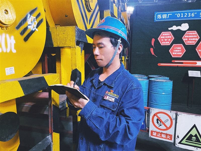 在火熱的連鑄生產(chǎn)現(xiàn)場,班長陳超所在的維修班嚴格執(zhí)行高溫天氣點巡檢制度,確保設備維護到位,聯(lián)鎖保護到位。悶熱炙烤的廠房里已是一片火熱,他們穿梭于臺上臺下,身上的藍色工服早已浸滿汗水。
