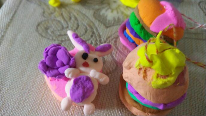妮子的手很巧,一盒橡皮泥在她的手里像施了魔法似的千變?nèi)f化,想要什么就捏什么:有七彩虹,有美味的心形蛋糕,有漂亮的蝴蝶仙子,有吃著胡蘿卜的兔子,有躺在嬰兒車?yán)锏男雰海刑自谑种干系拇蠡ㄖ腑h(huán),有掛在脖子上的漂亮吊墜,有小茶壺和小茶杯。旸程喜歡機(jī)器人,她就在手機(jī)上看了一眼,不一會(huì)功夫就捏出來了:藍(lán)色的身子,方形的頭,圓圓的眼睛,尖尖的耳朵,手里還托著個(gè)盤子,是專門送水或者送別的東西用的,竟和手機(jī)上的機(jī)器人相差無幾。旸程直夸“真不錯(cuò),真像,姐姐真棒!”再一會(huì)功夫,妮子又捏出了另一個(gè)機(jī)器人,倆人學(xué)機(jī)器人走路,學(xué)機(jī)器人對(duì)話,玩得不亦樂乎。