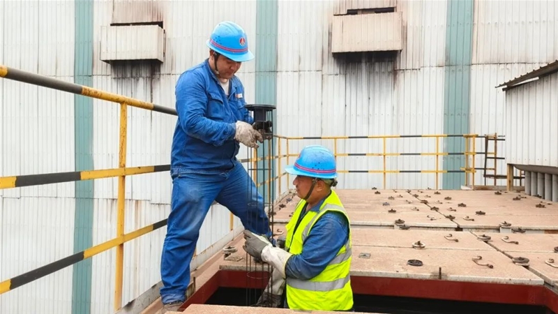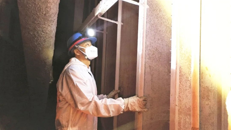 在完成通風(fēng)、氧含量和有害氣體檢測(cè)合格后,閆剛強(qiáng)“全副武裝”,對(duì)自己的勞護(hù)用品和安全工器具再一次確認(rèn),帶頭鉆進(jìn)40cm×50cm的長(zhǎng)方形人孔門,身著密不透風(fēng)的防塵服穿梭在40℃的電場(chǎng)內(nèi)部。兩臺(tái)除塵器8個(gè)電場(chǎng)的檢查任務(wù),讓他已無(wú)暇顧及艱苦的作業(yè)環(huán)境,僅半個(gè)電場(chǎng)就有21排極線、22排極板、22個(gè)振打錘。每一個(gè)他都要檢查陰極線有無(wú)彎曲斷裂、陽(yáng)極板有無(wú)脫槽、定位板有無(wú)脫落,振打錘有無(wú)磨損……確保回路完整和導(dǎo)線連接牢固。